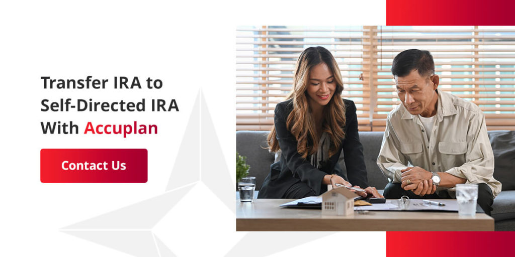 At Accuplan, we want to help you through the process. Below, we cover what an IRA transfer and an IRA rollover are, the factors you should consider to determine how to move forward and why you may want to transfer an IRA to a self-directed IRA with Accuplan.