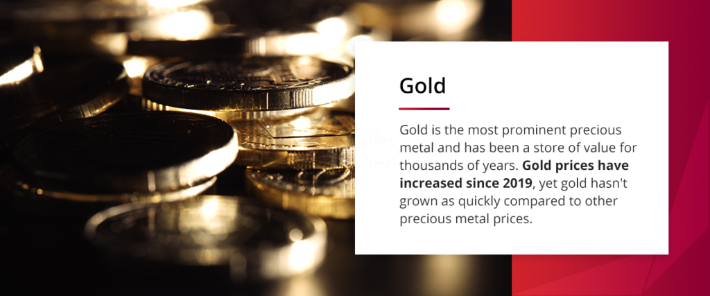 - Gold: Gold is the most prominent precious metal and has been a store of value for thousands of years. Gold prices have increased since 2019, yet gold hasn’t grown as quickly compared to other precious metal prices.
