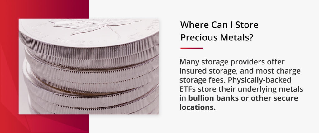 Physical precious metals come with the need for storage, making this form of precious metal cumbersome to manage. Keeping physical precious metals in an allocated account gives investors peace of mind. Many storage providers offer insured storage, and most charge storage fees. Physically-backed ETFs store their underlying metals in bullion banks or other secure locations.